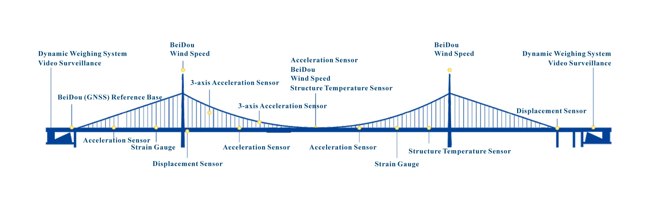 با استقرار سنسورهای مختلف، دستگاههای جمعآوری دادهها و تجهیزات انتقال بر روی سازههای پل، اندازهگیری خودکار بلندمدت بر روی اثرات بار، اثرات محیطی و پاسخهای ساختاری پل انجام میشود. دادههای اندازهگیری شده از طریق فناوریهای ارتباطی سیمی یا بیسیم به پلتفرم ابری منتقل میشوند و خدماتی مانند نظارت بر ساختار پل از راه دور، هشدار اولیه آنلاین، ارزیابی وضعیت و پشتیبانی تصمیمگیری را به مشتریان ارائه میدهند.
